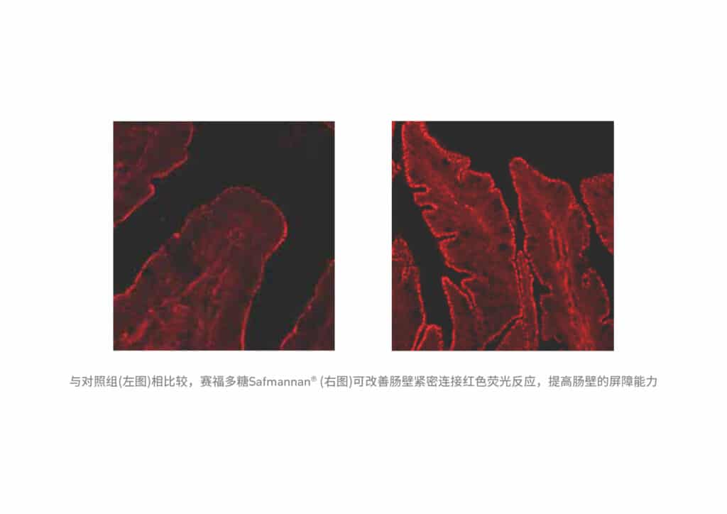 IRTA还进行了一项试验,评估赛福多糖Safmannan®对紧密连接完整性的影响。使用荧光法(突出显示ZO-1),显示赛福多糖Safmannan®组比对照组有更强烈的荧光斑点。这表明在局部炎症应激后紧密连接的完整性得到改善。