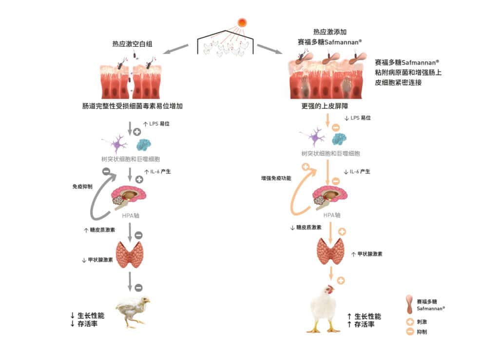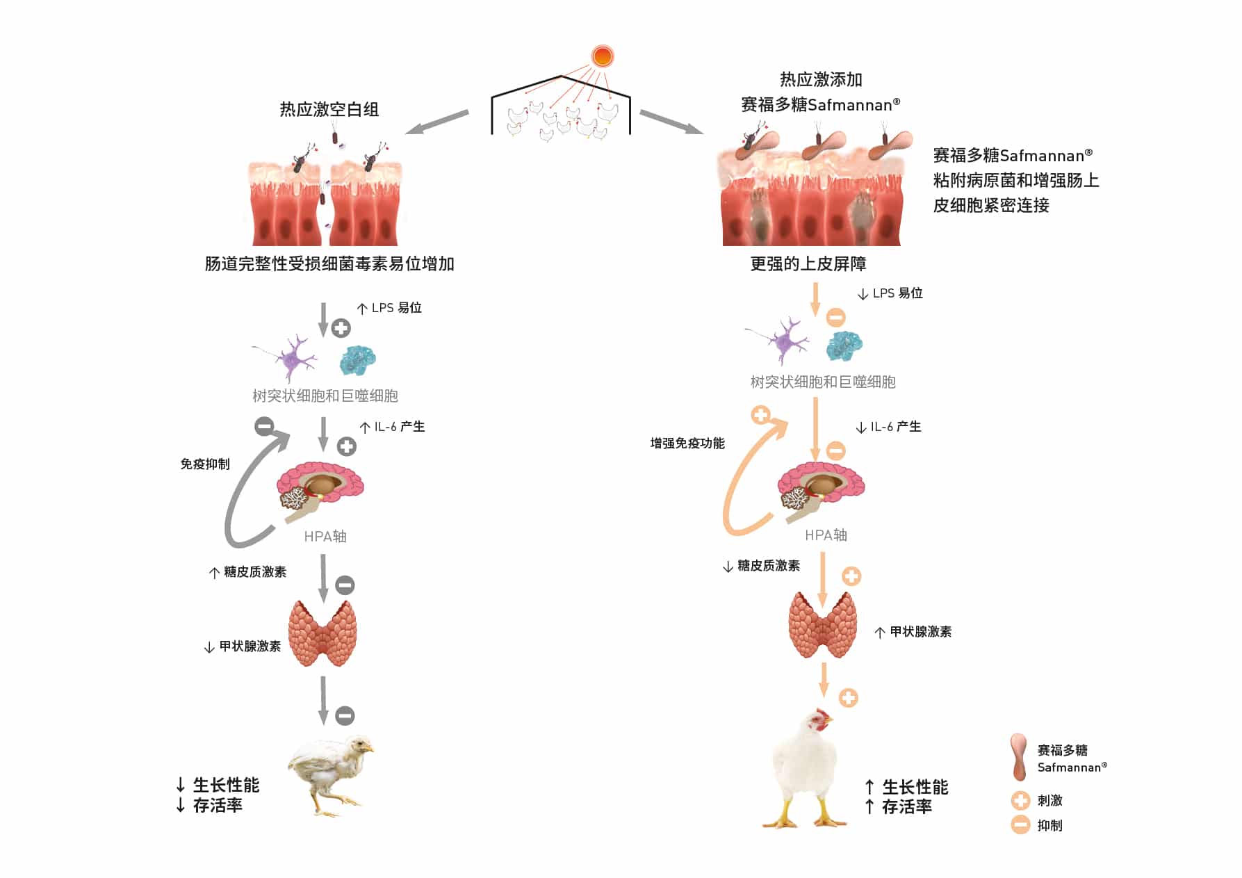 热应激的特点是动物机体能量需求增加,导致机体自由基(ROS)生成增加。一项在肉鸡处于慢性热应激期间分别添加饲喂赛福多糖Safmannan®和AGP(杆菌肽)的比较试验表明,在热应激的肉鸡日粮中添加250g/t赛福多糖Safmannan®组脂质过氧化水平显著降低,效果显著好于AGP组。